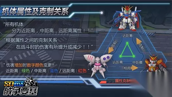 首先我们要了解,《SD敢达手游(已关服)》中机体被分为大类:近距离,中距离,远距离。其中的代表性机体分别为夏亚专用格鲁古古,巴纳吉·林克斯驾驶的独角兽敢达,哈曼·卡恩驾驶的卡碧尼。 从上面这张图我们可以了解到: 【近距离】机体克制【远距离】机体,但也被【中距离】机体所克制。 【中距离】机体克制【近距离】机体,但也被【远距离】机体所克制。 【远距离】机体克制【中距离】机体,但也被【近距离】机体所克制。 根据属性之间的克制关系,在战斗时的伤害有所提高或减少。 在正式的战斗中,界面左上角这也会有机体克制的示意图。场上的机体会分别以红绿蓝来表示远距离,近距离和中距离机体。