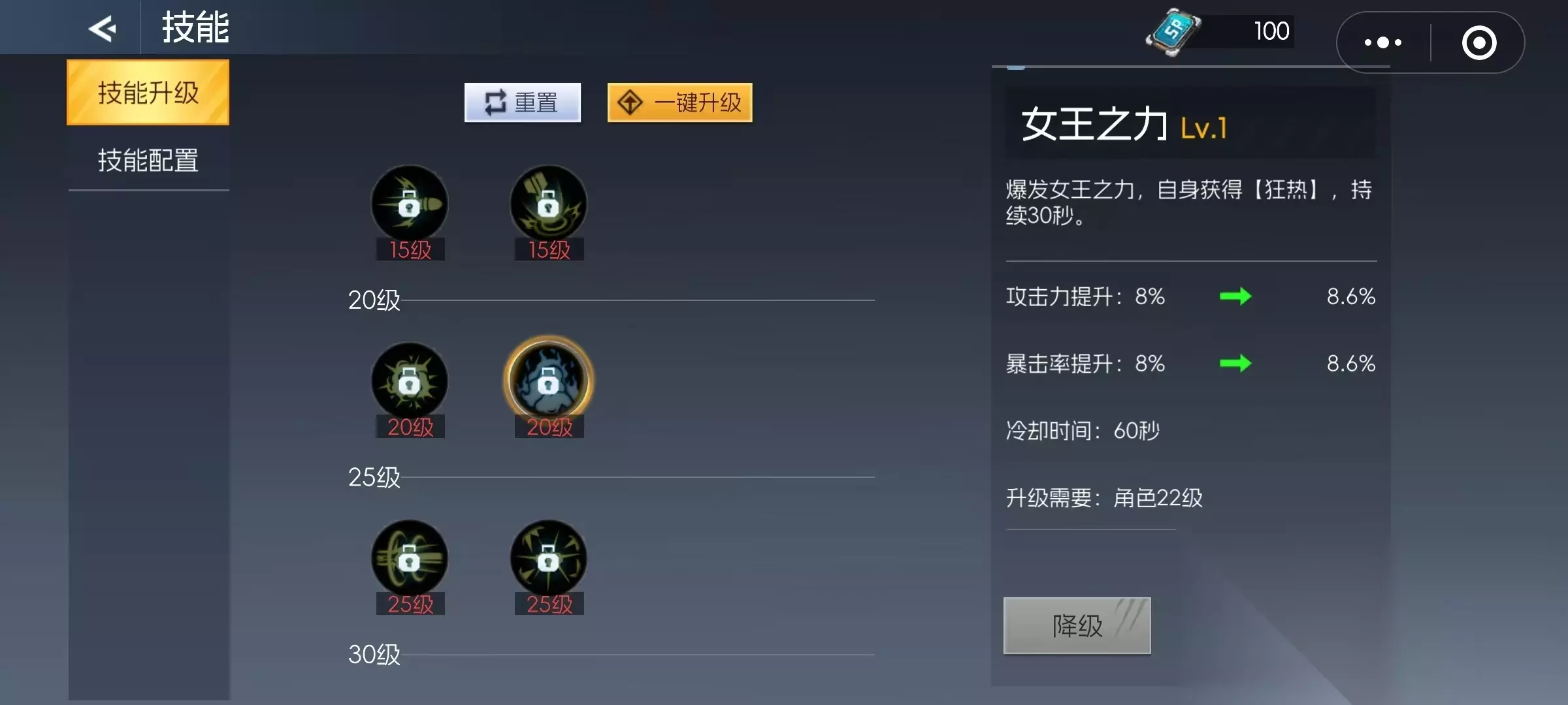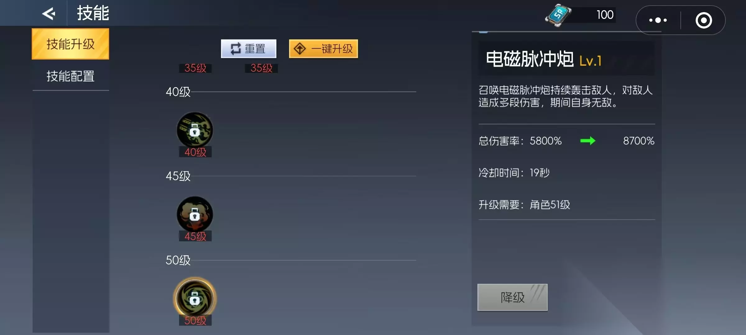 第5个怒焰地狱,40级的伤害技能,持续发射出怒焰,对前方敌人造成高额持续伤害,并使目标受到灼烧,持续6秒钟。第6个星轨冲击,45级破盾技能,呼叫出空间轨道攻击地面,向目标区域投放导弹造成大量伤害,该技能前摇有霸体时间,起飞后有较长的无敌帧。第7个技能电磁脉冲炮,50级终极技能,召唤出电磁脉冲炮持续轰击敌人,造成多段伤害,在此期间自身是无敌的。这些技能就是大家需要重点去加点的类型,从低级到高级都有涵盖,只要重点加这些技能,后续的连招就非常方便。