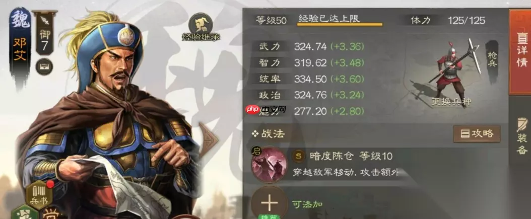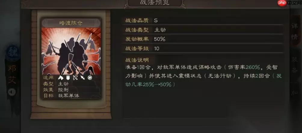 邓艾的核心绝技“暗度陈仓”必须绑定使用,堪称其灵魂所在!集超高发动率(50%)与强力控制于一身,在所有战法中堪称顶级配置。效果干脆利落:单体谋略伤害+直接施加“震慑”状态(原地罚站无法行动)。既然是谋略输出路线,属性加点务必优先堆满智力,确保伤害与控制双重生效!