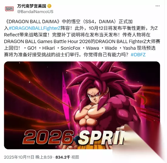 在法国举行的EVO龙珠斗士Z决赛现场,万代南梦宫揭晓了令玩家振奋的新消息。官方发布了一段全新预告片,正式宣布一位重量级角色即将加入战斗——超级赛亚人4悟空(大魔)。这位角色计划于2026年春季登陆游戏。 此次公布的超级赛亚人4形态悟空源自龙珠大魔系列,其登场将为现有角色阵容注入全新活力。与此同时,游戏将于2025年10月12日迎来一次重要平衡性调整更新,旨在优化对战体验并提升战术多样性。具体的调整内容将在更新当日完整公布。