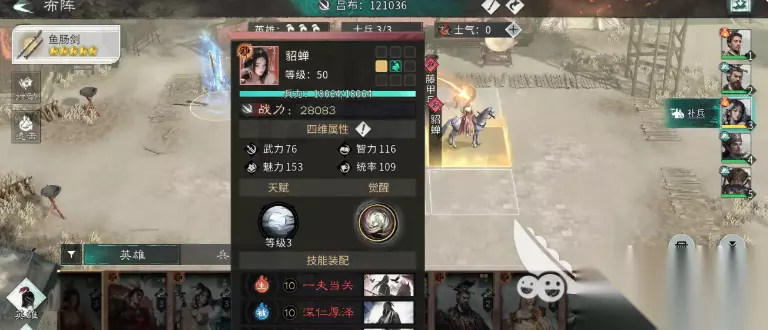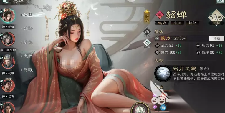 貂蝉这个角色在游戏中的定位为辅助型的武将,在众多辅助型武将中,貂蝉的整体表现可以说是相当不错的,她的爆发输出能力虽然不是特别的强悍,战斗中也无法承受住高额的伤害,可是貂蝉却凭借着自身强悍的控制能力和对于团队带来的强大辅助效果始终是玩家们的辅助首选。 貂蝉的天赋技能闭月之貌是一个可以提升等级的技能,这个技能可以让战斗在开始后,先给追击格上的武将附加上对男性英雄的增伤效果,追击时所造成的追击伤害将会直接变成百分百。