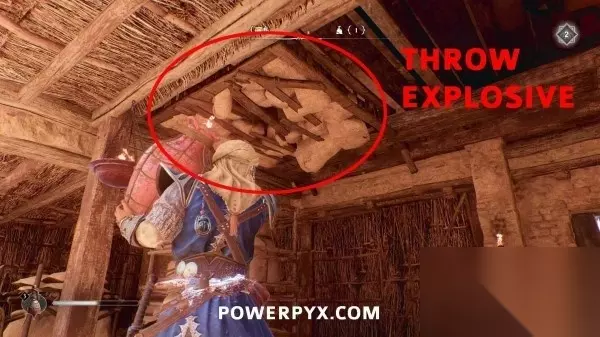 然后这个房间里还有一块可以破坏的天花板,从储藏室拿起另一个炸药桶朝房顶扔,或爬上外墙用飞刀引爆楼上的炸药桶。