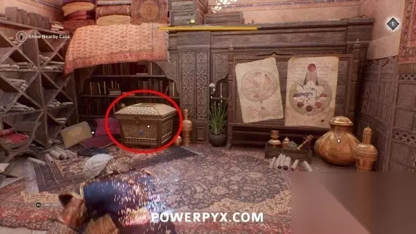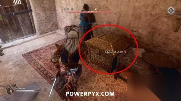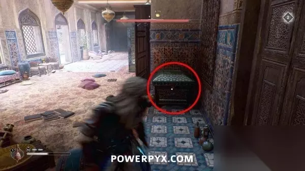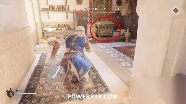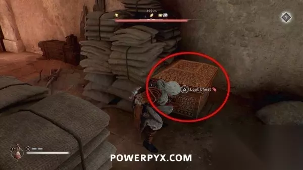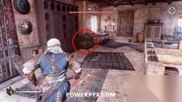 此装备箱在下层一个上锁的房间里,通往箱子所在房间的门在东侧,门是锁着的,需要用飞刀打碎门锁。从箱子西侧走穿过门洞,用飞刀击中门背后的锁即可。