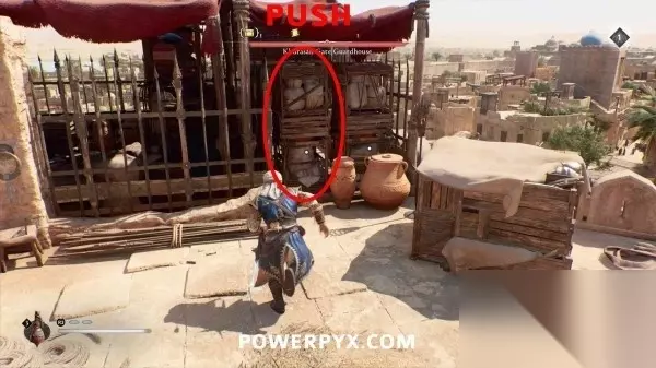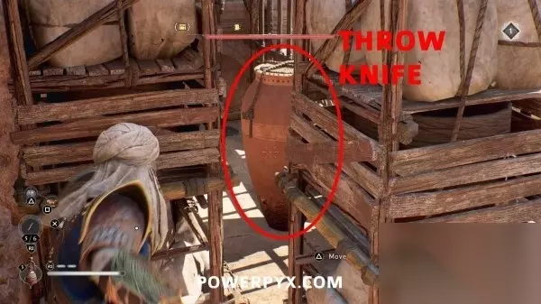 门外右侧角落有几个花瓶,用近战攻击打碎它们,花瓶后面的两个架子可以推开,将左侧架子往前推,右侧架子原地不动,然后从两个架子之间的开口处瞄准另一个花瓶,用飞刀打碎它。