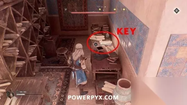 在智慧宫东北边屋顶上的一名NPC处偷到钥匙(具体位置在地图装备箱图标东北方向大约50米处),靠近NPC后按十字键左扫描,头上会显示一个白色放大镜标记,没偷成功的话就击杀他然后搜刮尸体。