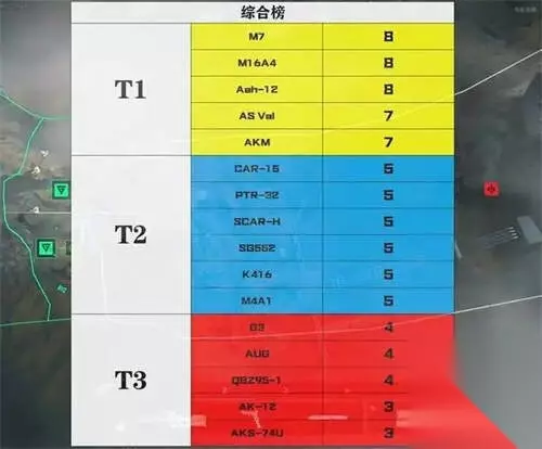 T2 1、M7:拥有高精准度和稳定的操控,同时具备高射速,短时间内发射大量子弹,从而提高打击效果。 2、PTR-32:高性价比,改装潜力大,操控速度和稳定性与AKM突击步枪相当。 T3 1、SCAR-H:重型攻击步枪,能够在提供伤害差距较小的情况下,保持低后坐力的性能,提升操作体验。 2、AK-12:有着更大的弹容量、单手操作能力以及多种组件配置,能满足不同的需求。
