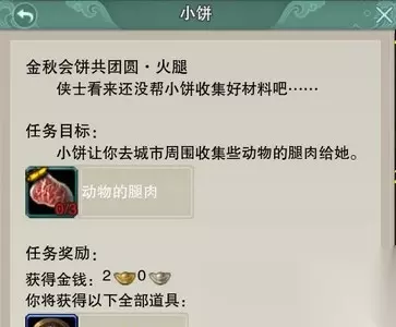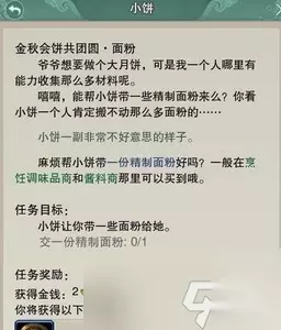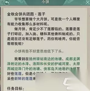 剑网3重制版是一款很非常好玩的游戏,受到很多小伙伴的喜爱。中秋活动金秋会饼共团圆系列任务需要我们收集木柴、莲蓬、火腿、超大的鸟蛋、精制面粉等材料,和npc神厨饼痴互动才可交任务。