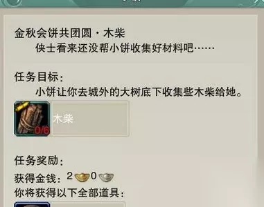 金秋会饼共团圆系列任务: 1.【木柴】在扬州城外的大树下面,人多需要拼手速抢,可以去人少的地方互动拾取,省时省心省力。