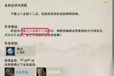 7.最后一个任务需要等到晚上八点至十二点【npc神厨饼痴】出现才可以交任务,不在规定时间内无法交任务。