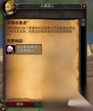 1.暴风城 贸易区 拍卖行门口找NPC<好心人>艾米苏·斯麦尔,购买【提古勒和弗洛尔的草莓冰激凌】 教堂广场 找NPC孤儿监护员南丁格尔,接《儿童周》任务后背包里会有一个孤儿哨,点击召唤后对话取得后续任务 2.西部荒野 《幽灵灯塔》左下角到达后点击孤儿哨,对话完成任务