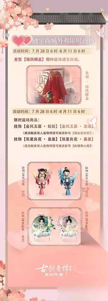 七夕今宵看碧霄,牵牛织女渡河桥。今日便是七夕啦,《古剑奇谭网络版》七夕活动正在进行中,仙家弟子们快来了解一下吧! 以下商品正在限时返场中,喜欢的仙家弟子不要错过…