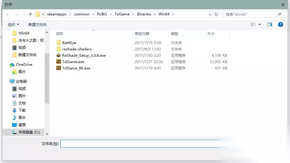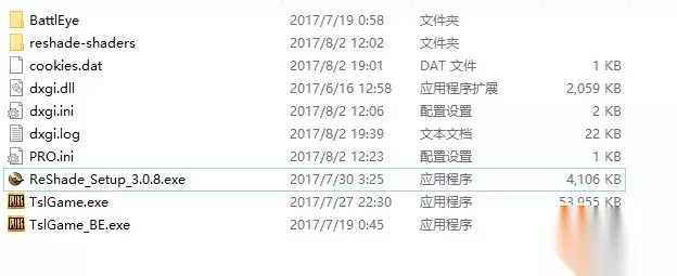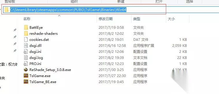 (游戏所在文件夹:STEAM游戏安装盘\steamapps\common\PUBG\TslGame\Binaries\Win64) 3.然后把Reshade资源内的文件移动到游戏所在文件夹