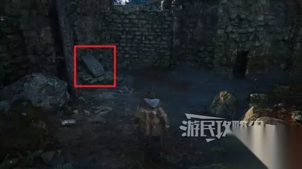 线索在同一区域内的破损巨大石板上,爬第二个梯子进入此区域时可以在地面上看到第一个半块。