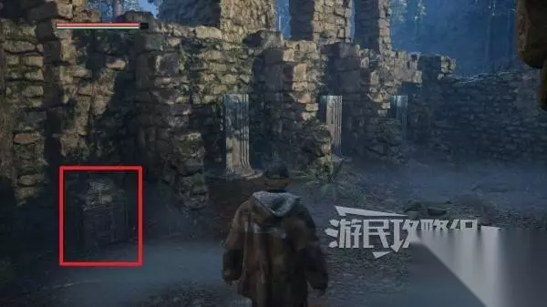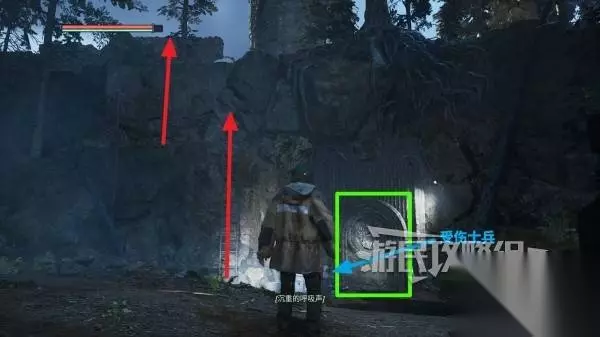 谜题解法 谜题位置在开局爬上受伤士兵旁边的两个梯子(参考下图红色箭头)。下图中的绿框为正确旋转石柱后开启的遗迹入口。