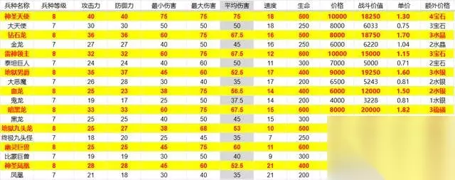 从上图中,我们已经可以看到9个8级兵和原来7级兵的纸面实力对比如何了。 同比9个种族,8级兵和7级兵的大致差异如下: 攻防基本上的提升幅度是20~30%左右,增幅最大的是大天使——神圣大天使,攻防都增加了33%,即10点。而增幅最小的血龙,同比鬼龙则是攻防增加了4点,虽然数值很少,但是也增加了30%。 而伤害普遍的增幅则达到了50%。最高峰的大天使从50提升到75;而最低点的凤凰也是从35点提升到了52点。 速度倒是基本没有变化,只有个别的兵种略微提升。最多的是终极九头怪变为地狱九头龙后,速度从7提升到了10点——不知道是不是名字里多了个龙,实际跑起来也快的缘故。 增加最可怕的,则是生命。 原本7级兵和四大龙族相比,基础属性差距并不是特别大。最大的问题就是生命差距太大。 7级兵最高的生命是300点,而四大龙族里最弱的紫龙也有500点生命,其他三个龙族更是高达700以上。基本都是7级兵的2倍有余。 而8级兵最大的改善,就是在7级兵基础上直接将生命翻倍。 这样一来,最弱的7级兵也有400点生命,最高的血量甚至达到了600点。虽然还达不到800,1000的水平。但是也比较接近了。这就让8级兵有了和四大龙族较量的资本。 最后呢,变为8级兵后的购买价格也自然提升了许多。基本上都是倍增的水平。 可是这点费用的提升,是比不上8级兵价值提升的。从战斗价值与性价比我们就可以看出,7级兵的性价比一般在0.7~1.6之间。而8级兵的性价比则至少都达到了1.3,高的甚至有2。 总而言之,如果看纸面实力,那么8级兵的提升已经相当明显了。而且除了纸面实力之外,8级兵的特性提升更高。 9个种族8级兵的特性提升: