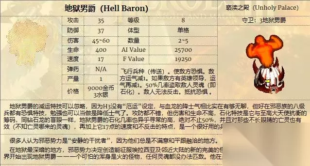 地狱男爵的特性提升和神圣大天使类似,运气-1提升为了运气-2;能够让敌人恐惧并且保留着无法反击的招牌。 除此之外,地狱男爵和钻石龙一样,也多了一个强力的控制技能——50%概率让对方被石化3回合,有了这个特性,基本上我们说地狱男爵是最强控制兵种一点问题也没有。