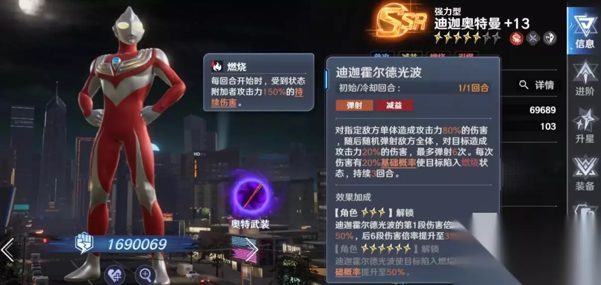 强力迪迦,燃烧流的绝对黑新年,小技能挂群体灼烧,并且灼烧伤害本身就有150%的群体倍率,大招则是偏向于单体爆发,这是其在很多场景中都能贡献稳定输出,是燃烧流不可替代的关键角色。 贝利亚,独特的输出路线,与血量挂钩,血量越高输出越高,他的优势在于自给自足,不依赖攻击增益,只要搭配回血和生存辅就可以独自撑起一整只队伍,很适合爬塔和持久战。不过考虑到缺乏强力单体输出,他在boss战的表现就逊色不少了。 T2: 闪耀迪迦,可以无限叠加护盾,这个手游里护盾是没上限的,这就使得他在拖回合、吃伤害方面极致很强。如果和强力迪迦搭配,后者负责施加灼烧,闪迪负责抗伤害,这样持续结算伤害,输出非常丝滑。不过从纯输出的角度,闪耀迪迦算上不顶级,而且获取成本也不低,属于是锦上添花,不过闪迪情怀在这里,很多人还是会去抽的。