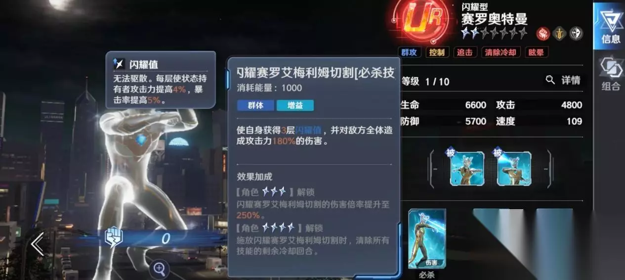 输出排行榜: T0: 闪耀赛罗奥特曼,公认的强,几乎是没有什么争议的,群体技能倍率来到了250%,单体输出在理想情况下也能来到600%,不管是清图还是打boss都有很强的统治力。只要资源够,就可以作为任何阵容的终极答案,唯一的短板就是获取和培养的成本极高,是氪佬必备的。 T1: 普通赛罗,如果说闪耀赛罗是神的话,那么普通赛罗就是良心卡了,群体输出机很优秀,群体倍率能有300%,单体击杀后的还能触发无限追击,实际效果等同于群攻。单体方面,在敌人有被挂debuff的时候,倍率也能来到510%也是很可观的了,兼顾了清杂和点杀。更为重要的是,作为紫卡,他的培养成本很低,成型快,很适合平民、微氪用户,是当前最值得优先培养的输出核心之一。