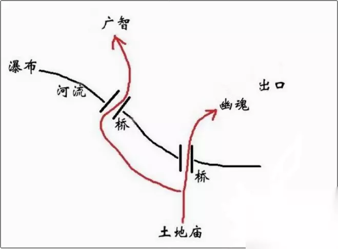 3、参考我画的简图,从土地庙出发,瀑布就在最左边,一直往左走就能找到。