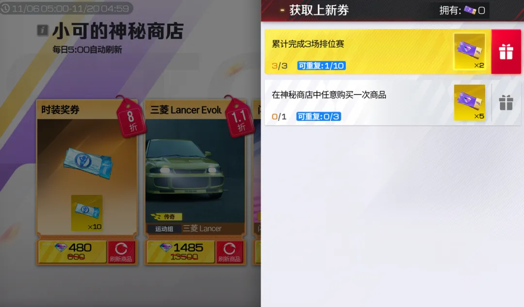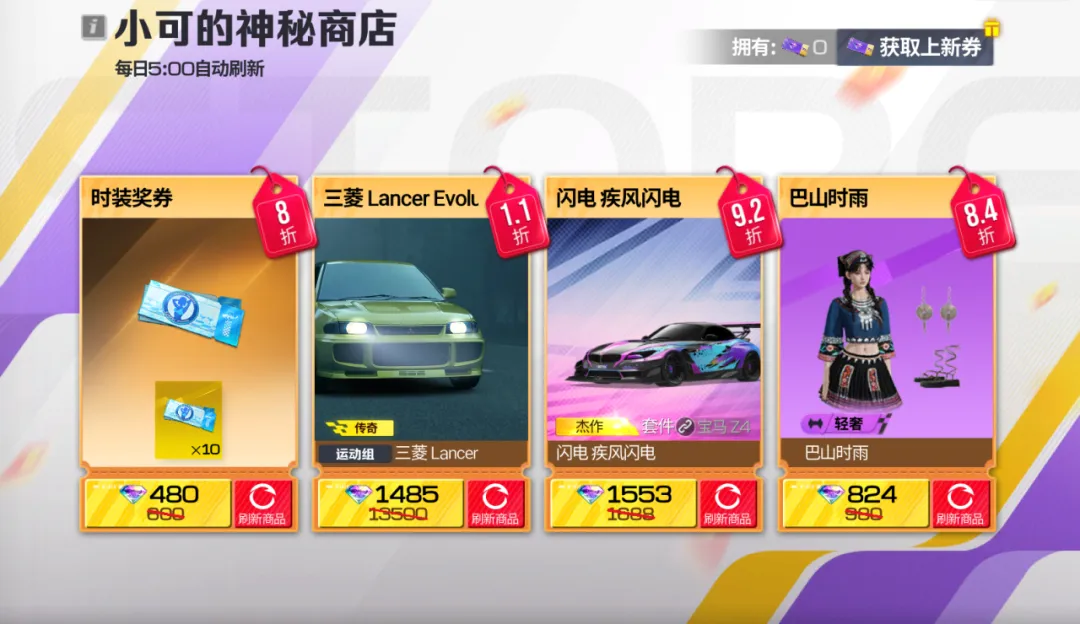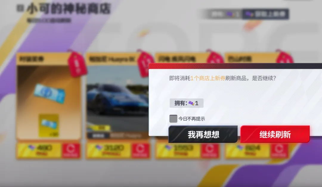 车手们也不用担心没有遇到你心仪的商品,只要完成排位赛任务或在神秘商店中任意购买一次商品即可获得“神秘商店上新券”,使用上新券可手动立刻刷新一个货架的商品,并有机会获得更低的折扣!(上新券在活动结束后将失效,所以车手们要记得在活动期间尽量全都用掉哦~)