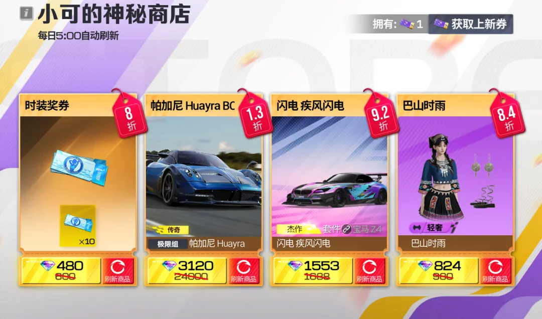 小可为你准备了4个货架,每日早上5点,4个货架全部刷新!车辆、套件、时装每次打开都是新惊喜!遇到真爱就果断下手吧!因为……每个货架活动期间只能买1次,已购买过的货架后续将不再刷新。
