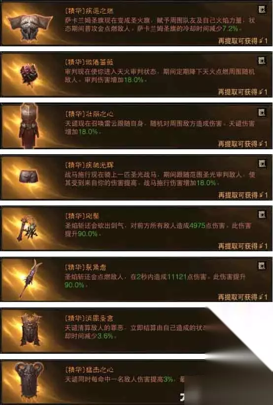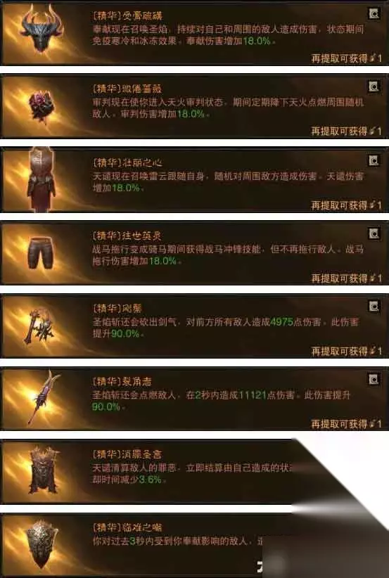 技能推荐:奉献、审判、天谴、战马拖行、普攻圣焰斩 BD简介:这套是圣教军目前伤害最高的天火审判流,缺点在于护肩带了微倦蔷薇没有战马拖行的持续时间增加,很多玩家做不到无限骑马。但是天火的伤害确实很客观,下马后我们主手刚鬃+裂角者输出即可。 套装推荐:4安格美特2维图2男爵 二、圣教军火旗审判流