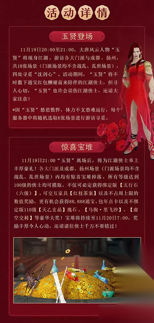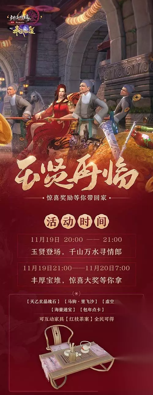 天降惊喜,玉贤再临,《剑网3》邀你一同领丰厚好礼!11月19日20:00,大唐风云人物“玉贤”现身江湖,撒下满天红包雨!惊喜宝堆从天而降,人人皆可摸取!可交互家具【红枝茶案】全民可得,88,888通宝、10年点卡、不绑定版110级【天乙玄晶】瑰石、【马驹·里飞沙】、【虚空交椅】等你来拿!玉贤登场,好礼相送,各位侠士千万不要错过! 当然,玉贤也不负众望,经历七年打磨换以全新形象,更具魅力的他今晚将现身大唐江湖,为诸位侠士奉上惊喜福利! 七年已到,风云人物再度归来!今晚玉贤与你相约江湖不见不散! 全民献礼,玉贤送福利!11月19日20:00至21:00,大唐风云人物“玉贤”将现身江湖,游访各大门派与成都、扬州,共18张场景(门派场景均不含战乱、乱世场景)。活动期间,“玉贤”将不时撒下通宝红包酬谢前来陪伴的江湖侠士。不过资讯君也要提醒大家,寻人心切的“玉贤”或许会误伤侠士,还请多加注意! 而在11月19日21:00“玉贤”离场后,还将为江湖侠士奉上丰厚豪礼!各大门派及成都、扬州场景(门派场景均不含战乱、乱世场景)内均有惊喜宝堆掉落,所有等级达到100级的侠士均可摸取,不仅可必定获得绑定版【五行石(六级)】、可交互家具【红枝茶案】以及不占周上限的数值奖励,更有机会获得88,888通宝、10年点卡以及不绑定版110级【天乙玄晶】瑰石、【马驹·里飞沙】、【虚空交椅】等豪华大奖!宝堆将持续至11月20日7:00,还请诸位侠士留意时间不要错过哦!