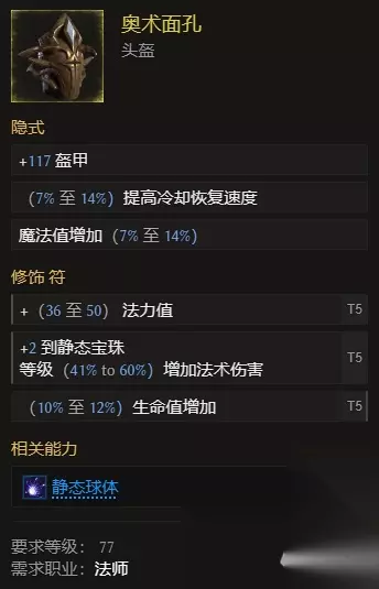 优点: 1、伤害的上限是非常高的,全黄装备可以一次打出1500万的单体伤害。 2、不需要绑定暗金,核心的增伤并不依赖游戏中的暗金,建议伤害的暗金获取策略也非常简单。 3、可以保证在战斗的时候拥有60%+的移速加成,很难被敌人攻击到。 缺点: 1、毕业的黄装对基底的规定比较高,对于头盔和胸甲的限定基底规定较高。 2、核心的增伤机制比较依赖雕像的词缀,没有好词缀需要刷很多。 3、需要拥有一定的步骤手法,不然打起来的体验将会不是很好。 头盔: 头盔选择奥术面孔就非常不错,可以与静态球体起到一个相辅相成的影响力,很好的增强输出能力。
