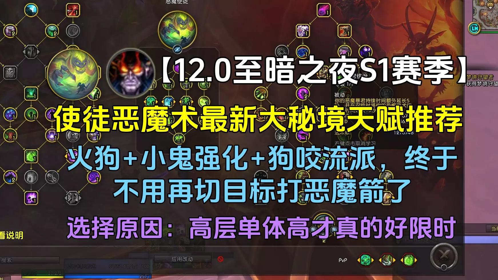 这是魔兽世界至暗之夜S1赛季的恶魔术玩法攻略,指出该版本恶魔术仍需点出二号机魔典,还讲解了大秘境里的驱散要求,搭配天赋界面、大秘境地图等内容辅助说明。