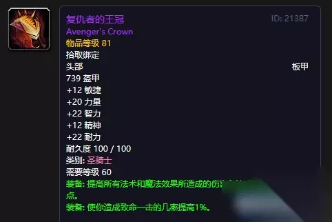 部位:头部 分类:板甲 护甲:739 盔甲 敏捷:+12 耐力:+22 力量:+20 智力:+22 精神:+12 耐久:100/100 专属: 圣骑士 装备需求:60 效果:提高最多23点法术和魔法造成的伤害和治疗。 效果:提高1%的暴击率。