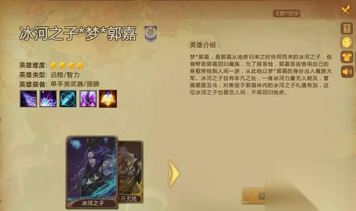 梦三国2梦郭嘉玩法攻略 一、人物介绍 梦郭嘉,是郭嘉从地府归来之时协同而来的冰河之子,他助郭嘉回归魔族一臂之力,为报答他,梦郭嘉答应借用自己的身躯带他到人间一游,他以梦郭嘉的身份出入魔族大军。