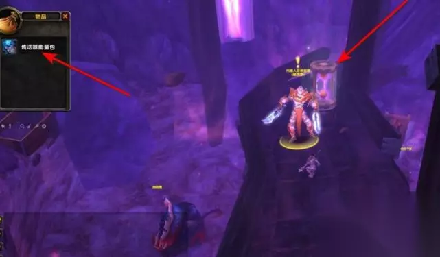 3、玩家进入瑟安竖井后,往左侧的分支洞穴走,走到分支洞穴的尽头后,可以看到一个NPC和一个沙漏,玩家靠近沙漏后点击沙漏打开即可拾取到传送器能量包。