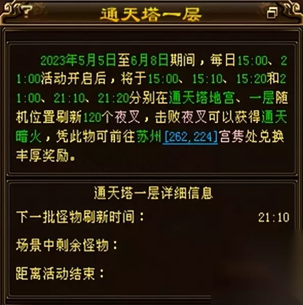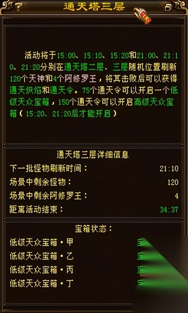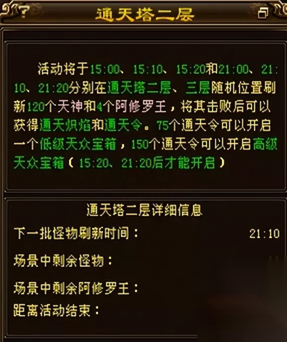 地图没什么改动和以前的地图一模一样 进入通天塔后,右下角就会显示下图的标记(怪物刷新时间/剩余怪物/活动结束倒计时)