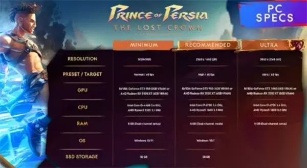 波斯王子失落王冠配置要求一览 一、最低配置 CPU:Intel Core i5-4460 3.4 GHz、AMD Ryzen3 1200 3.1 GHz(这两款够用,别太差就行) 显卡:NVIDIA GeForce GTX 950 (2GB VRAM) 或 AMD Radeon RX 5500 XT (4GB VRAM)(显卡别太拉胯,不然画面卡) 内存:8GB (双通道)(内存够用,别卡顿) 硬盘空间:30GB(空间别不够用,下个游戏不容易) 操作系统:Windows 10/11 (64-bit)(系统别太老,不然出问题)