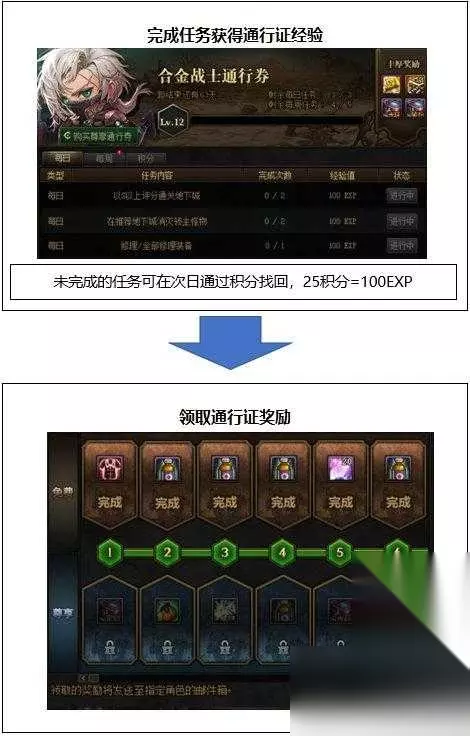 其中体验之章需要按照箭头的顺序依次完成,探索之章则无顺序要求,每个目标仅需完成一次目标地下城即可。 合金战士通行证