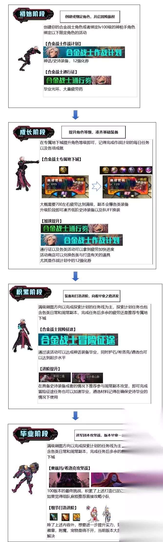 最快升级就是全疲劳格兰之森4点疲劳,最后一点疲劳刷兽人峡谷全图,不过不建议这样刷,建议优先刷通行证。 一图看懂合金战士成长线 合金战士有专门属于自己的成长线以及刷图副本,不用担心进度跟不上,只需跟着进度走即可轻松追上大部队 根据养成情况分为了四个阶段,以下为详细的路线介绍