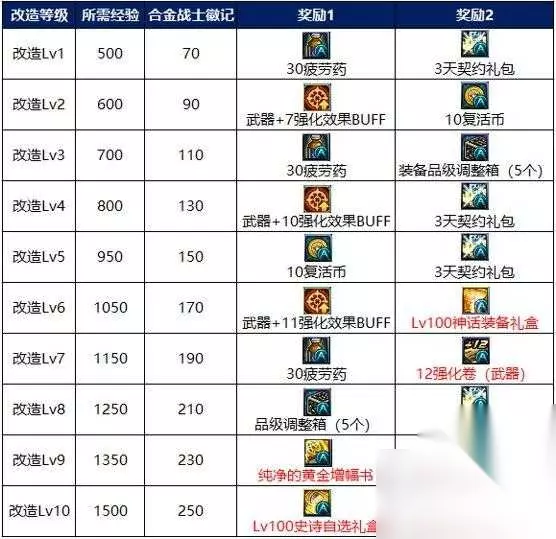 活动页面可查看所有可完成的成就,每个地下城都有通关42次的成就,建议在升级时优先完成。完成成就可获得改造经验用于提升改造等级 提升改造等级与分解活动史诗可获得合金战士徽记,合金战士徽记可在活动NPC抵抗军梅恩处兑换大量奖励。