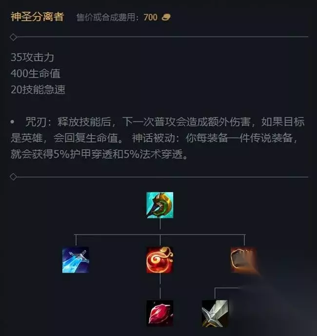 第一件——神圣分离者 这是一件神话装备,也是一刀流诺手的装备精髓。 《英雄联盟》现在已经进入了神话装版本,所以,神话装必须第一时间做出来! 神圣分离者的被动,是释放技能增加额外伤害,而且每出一件传说装备就增加5%的护甲穿透。 这件装备,可以说就是为了秒人而生的。