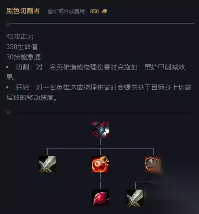 第三件——黑色切割者 想玩一刀流诺手,出装方面的思路就是穿甲流! 黑切这件装备自诞生之日起就是诺手的核心装备。 即便到了现在的神话装版本,很多诺手玩家在出完神话装备后,第二件首选依然是黑切。