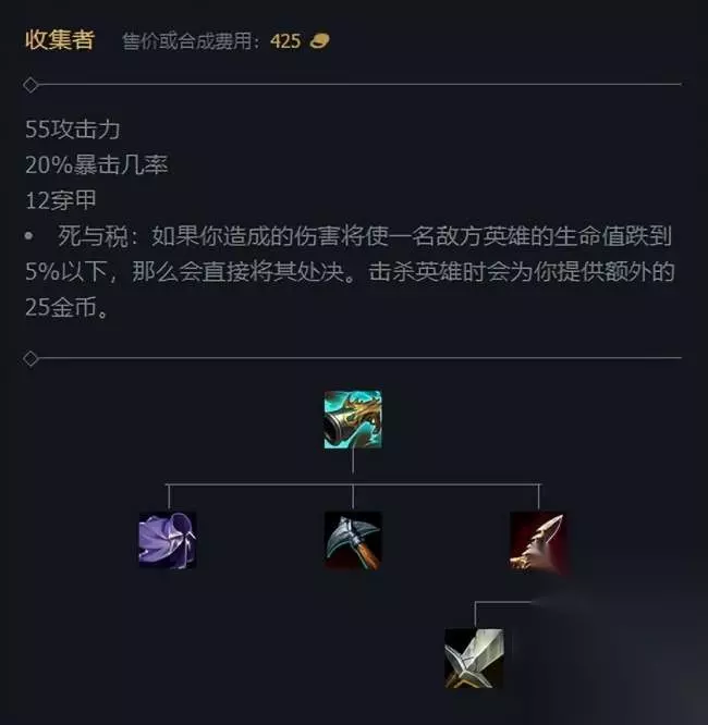 第二件——收集者 这是一件当之无愧的残血收割装备! 有暴击,有穿甲,最重要的是,敌方英雄的血量低于5%以下后可以直接斩杀。 想玩一刀流诺手,这件装备也是必不可少的!