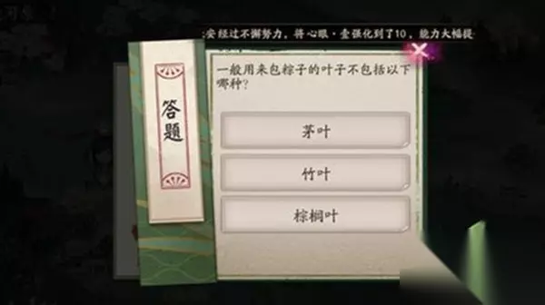 t15_2-t15_1:8.0 标签: 包粽子 阴阳师一般用来包粽子的叶子不包括以下哪种?可能有不少玩家还不清楚阴阳师6.18端午答题活动包粽子的叶子不包括什么吧。下面就让233乐园小编为大家带来,阴阳师包粽子的叶子不包括答案参考。