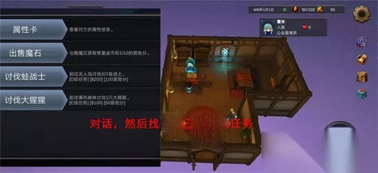 1.首先见完女神进去之后的房间界面,有些玩家不仔细看对话框,可能到这里就开始疑惑了; 这里是初始的角色房间,可以睡觉获得体力;也可以把背包里的物品放在储物箱里。右边的背包按钮可以查看个人信息和背包物品,在获得新物品以及习得新技能之后,记得打开背包装备上。