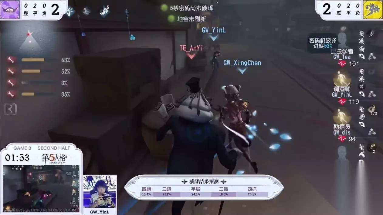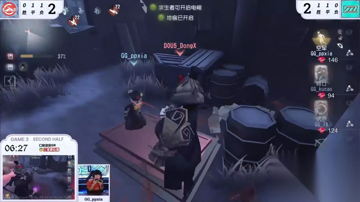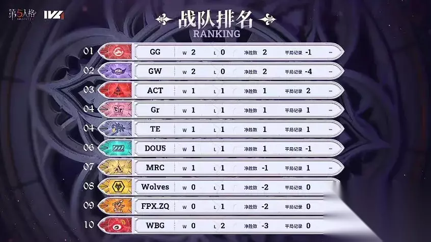 首周的比赛中,十支战队均完成首秀,其中成都GG和GW战队连胜两场,交锋精彩,难分上下。 【精彩回顾】 第一天DOU5 vs 成都GG第三局下半局,GG求生者后发制人,GG_ppxia地窖逃生三出翻盘:鏖战两场比分微落后的成都GG选出熟练的舞女和心理学家体系应对DOU5_DongX记录员,在bp上首先拿到优势。记录员带兴奋追击空军,但GG_ppxia开局便交枪,把控cd时间,拉开距离上大房二楼,记录员换追心理学家。GG新人GG_fulan被记录员抢窗险些震慑,但恰好利用记录员收记录僵直完成翻窗用出弹射,心理学家转到木屋,病患舞女陪跑牵制,心理学家再次转入八音盒双板区,又一路拉点到角落,倒地时电机仅剩一台。此时GG_ppxia空军摸到了怀表,铺垫开门战。GG_fulan心理学家再次被抢窗后极限翻,拖够电机。记录员蓄力刀在月亮门击倒心理学家后将其淘汰,但GG_ppxia空军也在月亮门,大门破译被锁,但是GG_ppxia利用怀表拖延了二十秒,记录员让身位,GG_ppxia飞轮预判记录员底牌切闪现,在地窖口利用记录刀的受伤加速,博弈记录员空刀后极限跳地窖完成三出翻盘。