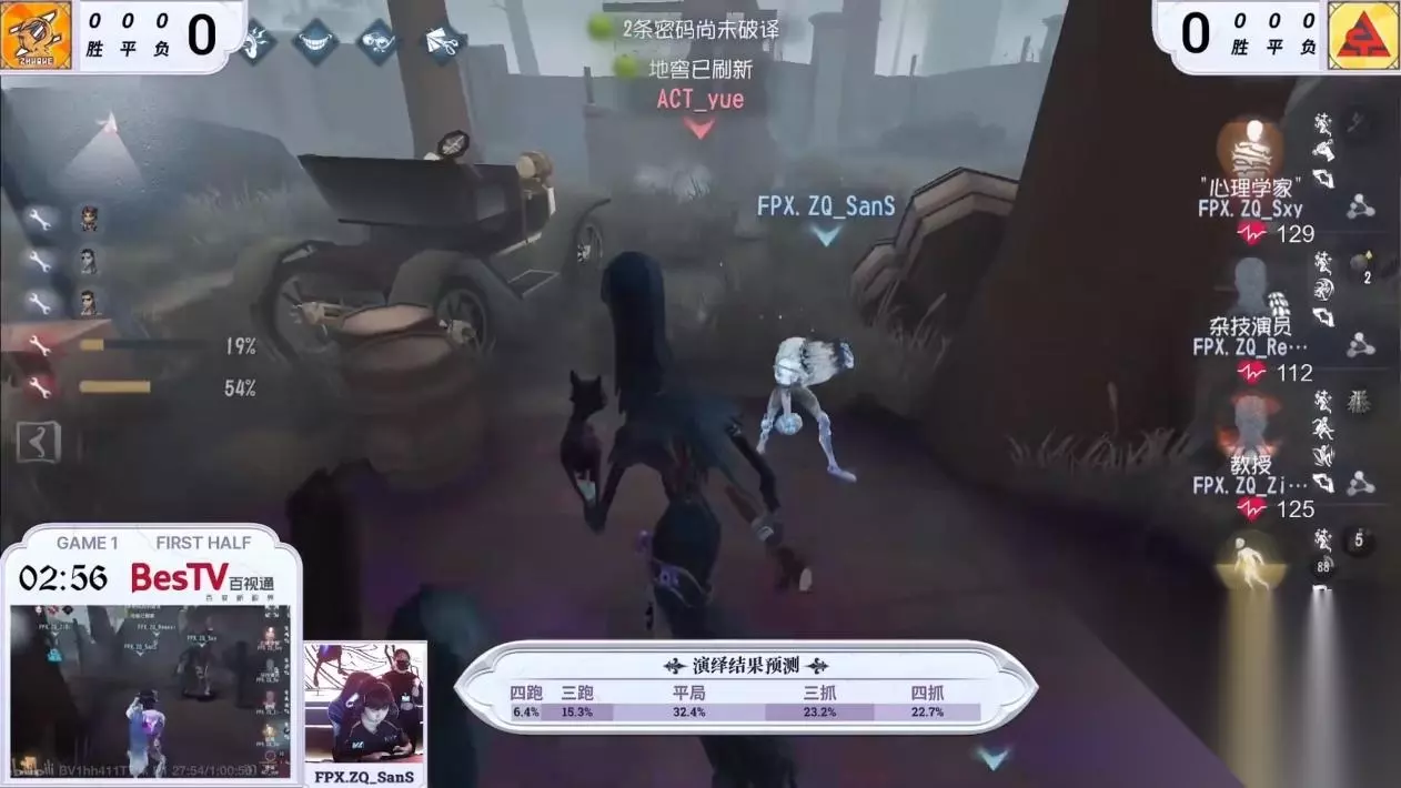 图为空军地窖口博弈出刀 第二天,FPX.ZQ vs ACT,ACT_yue使徒极致守椅拿下四抓:ACT_yue使徒开局追击心理学家,博弈抽刀,下一只猫吃刀后前锋擦刀期间补撞让心理学家转到中场再到大门废墟,逼出使徒闪现后被击倒挂上。在守椅中,使徒向大房方向排点拦截救人的前锋,前锋无法卡半,同时杂技演员被迫离开电机准备双救补位,让前锋得以贴近狂欢之椅,电机进度被拖慢。ACT_yue回防,蓄力刀骗盾拿到一刀,两只猫返回,晕住打断前锋的回旋球,将前锋击倒无缝衔接节奏。一只猫排到救人的教授,使徒扭跳逼救,回来的猫晕住救下人的教授,换挂教授,而半状态前锋被卡在废墟的位置。ACT_yue选择继续追击教授,在大房击倒挂回大门沉默修机的前锋,ACT_yue自信深入追击并淘汰教授,电机进度不够,后逐一击破拿下四抓。