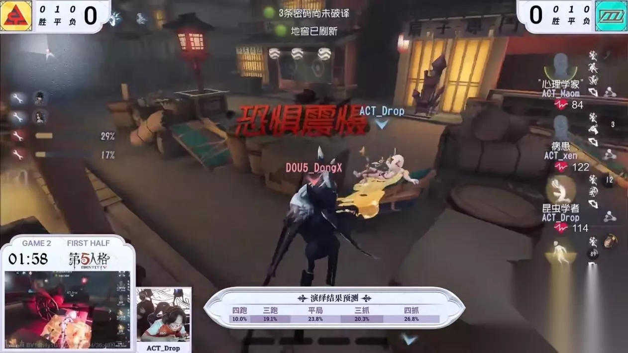 图为佣兵护腕扛刀扳回局势 第三天DOU5 vs ACT第二局上半局,DOU5_DongX守夜人追击控场双管齐下四抓:DOU5_DongX守夜人减速昆虫学者的拉点开局快速拿刀,果断闪现击倒。后精准冲刺到前锋身后逼球,接着一个加速逼出飞轮,昆虫学者即将自愈,前锋预判螺旋球但DOU5_DongX没有牵人而是向外压迫,前锋拉球躲避却被电车撞。昆虫学者自愈后,DOU5_DongX选择继续追击,一个侧刀极限距离震慑翻板的昆虫学者。两台半电机DOU5_DongX守夜人开出二阶并挂上昆虫学者。二救后守夜人闪牵昆虫学者,气球刀击倒前锋,此时还剩半台电机,DOU5_DongX凭借守夜人的高机动性和清晰思路控机控状态:心理学家移情给病患救人,DOU5_DongX直接两个冲刺将残状态心理学家赶下二楼电机将其逼往墓地,然后回防打断病患与前锋补状态,博弈抽刀打残病患,又一个冲刺博弈飞轮在远处击倒前锋挂上,新起的电机不够,场上无人可救人,DOU5_DongX开门战击倒病患挂上后稳健传送落地,击倒心理学家拿下四杀。