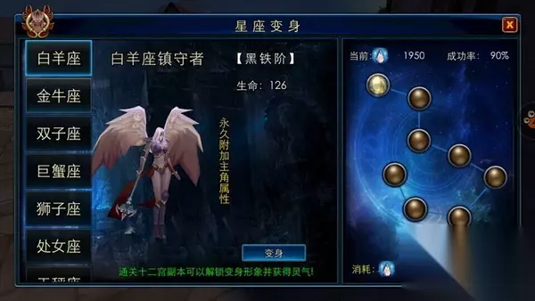 踏入曙光之战用不了多久,就会遇到各式各样的副本纷纷开启,每个副本不仅掉落有异,打法也很值得深究。就让我们一起去探寻下这些副本暗藏的玄机,征服不可一世的BOSS们吧! 主线开启单人副本:变身挑战【十二宫】 十二宫副本,就是分别挑战十二星座,每挑战成功一个星座,就可以变身成对应星座。每天挑战还可以获得灵气的奖励,每个星座每天可以挑战一次,如果成为VIP之后可以直接扫荡打过的星座。 PS:灵气可以用于每个星座的品质进阶,星座会有给力的属性加成哦,即使不变身的情况下,也会增加的。