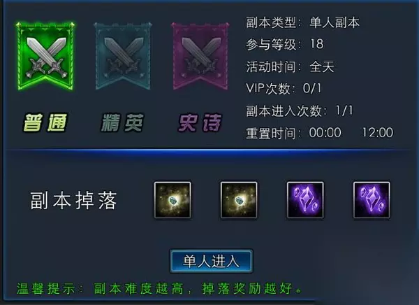PS:当然,副本的奖励,会随着难度的增加而不断提升的喔。 22级开启单人副本:富饶沃土【黄昏之地】 副本难度分为: 22级开启普通模式 50级开启精英模式 75级开启史诗模式