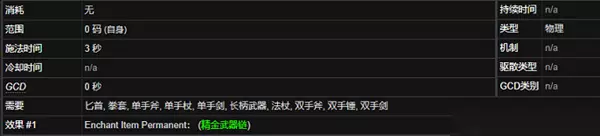 施法时间:3秒 需要:近战武器 使用效果:在你的武器上附加一条锁链,使缴械效果的持续时间缩短50%,你的招架等级提高15。不与其它同类效果叠加。该武器等级不得低于60级。 类型:永久附魔 法术细节:
