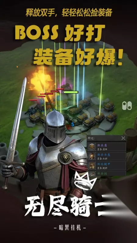 在这款游戏里,我们需要持续收集并招揽三国时期的知名将领,借助训练与精心培育来增强他们的战斗力。同时,玩家要运用谋略来组建合适的战斗阵容,并调整将领的站位,以此攻城占地,最终实现三国一统的宏愿。除此之外,更有充满挑战的征战之路通关玩法,玩家通关之后还能收获丰厚的游戏奖励。 手机扫码下载233乐园APP预约 预约订阅最新动态 优先233乐园APP下载 3、《无尽骑士:暗黑挂机》