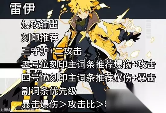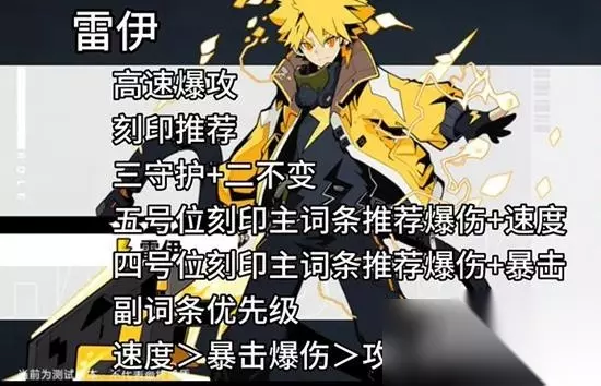 赛尔计划雷伊刻印选什么 高速爆攻 1、三守护+二不变。 2、五号位刻印主词条推荐爆伤+速度。 3、四号位刻印主词条推荐爆伤+暴击。 4、副词条优先级:速度>暴击爆伤>攻击比>精准。 点评:既可以提速也不缺乏输出,这套刻印能将雷伊最强实力发挥出来。